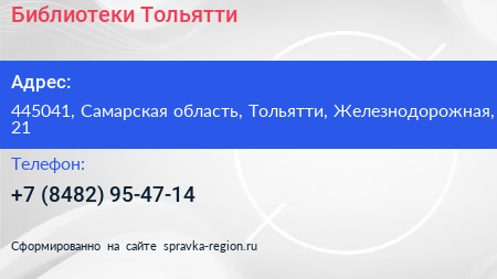 Библиотеки Тольятти по адресу 445041, Самарская область, Тольятти, Железнодорожная, 21 в дальнейшем Организация, размещена в следующих категориях: