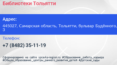Библиотеки Тольятти по адресу 445027, Самарская область, Тольятти, бульвар Будённого, 3 в дальнейшем Организация, размещена в следующих категориях:
