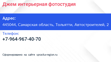 Джем, интерьерная фотостудия по адресу 445044, Самарская область, Тольятти, Автостроителей, 2 в дальнейшем Организация, размещена в следующих категориях: