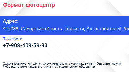 Формат, фотоцентр по адресу 445039, Самарская область, Тольятти, Автостроителей, 96 в дальнейшем Организация, размещена в следующих категориях: