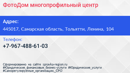 ФотоДом, многопрофильный центр по адресу 445017, Самарская область, Тольятти, Ленина, 104 в дальнейшем Организация, размещена в следующих категориях: