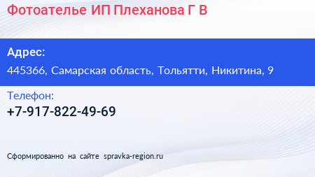 Фотоателье, ИП Плеханова Г.В. по адресу 445366, Самарская область, Тольятти, Никитина, 9 в дальнейшем Организация, размещена в следующих категориях: