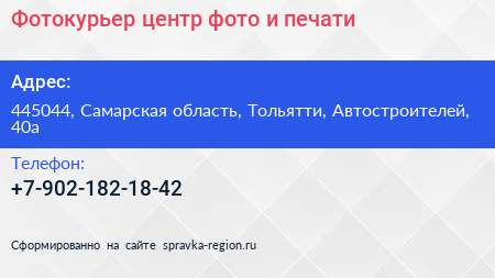 Фотокурьер, центр фото и печати по адресу 445044, Самарская область, Тольятти, Автостроителей, 40а в дальнейшем Организация, размещена в следующих категориях: