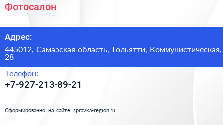 Фотосалон по адресу 445012, Самарская область, Тольятти, Коммунистическая, 28 в дальнейшем Организация, размещена в следующих категориях:
