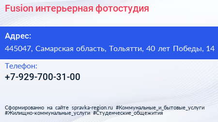 Fusion, интерьерная фотостудия по адресу 445047, Самарская область, Тольятти, 40 лет Победы, 14 в дальнейшем Организация, размещена в следующих категориях: