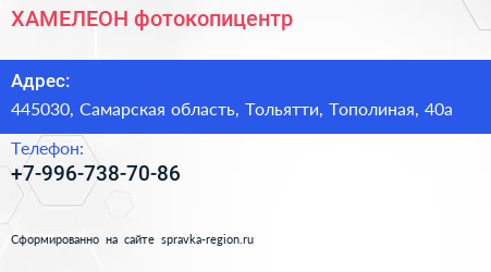 ХАМЕЛЕОН, фотокопицентр по адресу 445030, Самарская область, Тольятти, Тополиная, 40а в дальнейшем Организация, размещена в следующих категориях: