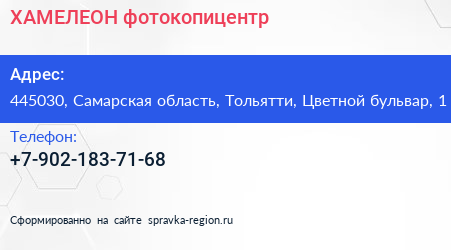 ХАМЕЛЕОН, фотокопицентр по адресу 445030, Самарская область, Тольятти, Цветной бульвар, 1 в дальнейшем Организация, размещена в следующих категориях: