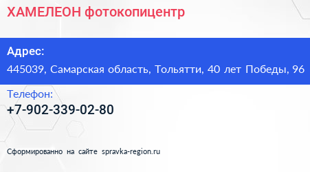 ХАМЕЛЕОН, фотокопицентр по адресу 445039, Самарская область, Тольятти, 40 лет Победы, 96 в дальнейшем Организация, размещена в следующих категориях: