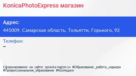 KonicaPhotoExpress, магазин по адресу 445009, Самарская область, Тольятти, Горького, 92 в дальнейшем Организация, размещена в следующих категориях: