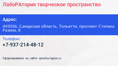 ЛабоРАтория, творческое пространство по адресу 445036, Самарская область, Тольятти, проспект Степана Разина, 8 в дальнейшем Организация, размещена в следующих категориях: