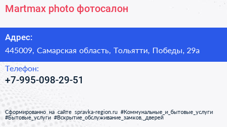 Martmax photo, фотосалон по адресу 445009, Самарская область, Тольятти, Победы, 29а в дальнейшем Организация, размещена в следующих категориях: