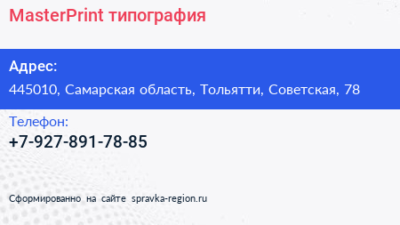 MasterPrint, типография по адресу 445010, Самарская область, Тольятти, Советская, 78 в дальнейшем Организация, размещена в следующих категориях: