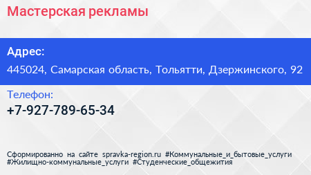 Мастерская рекламы по адресу 445024, Самарская область, Тольятти, Дзержинского, 92 в дальнейшем Организация, размещена в следующих категориях: