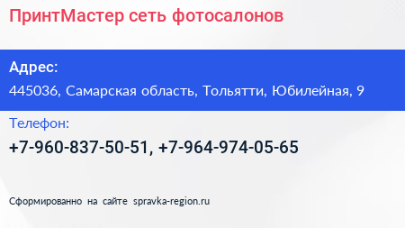 ПринтМастер, сеть фотосалонов по адресу 445036, Самарская область, Тольятти, Юбилейная, 9 в дальнейшем Организация, размещена в следующих категориях: