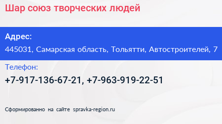 Шар, союз творческих людей по адресу 445031, Самарская область, Тольятти, Автостроителей, 7 в дальнейшем Организация, размещена в следующих категориях: