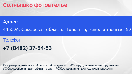 Солнышко, фотоателье по адресу 445026, Самарская область, Тольятти, Революционная, 52 в дальнейшем Организация, размещена в следующих категориях: