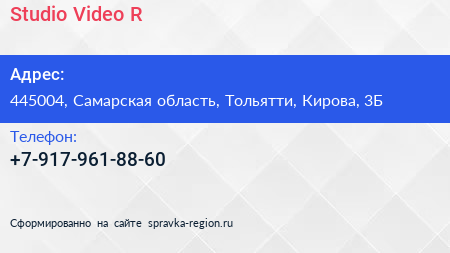 Studio Video-R по адресу 445004, Самарская область, Тольятти, Кирова, 3Б в дальнейшем Организация, размещена в следующих категориях: