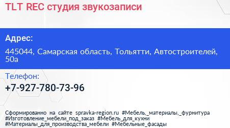 TLT REC, студия звукозаписи по адресу 445044, Самарская область, Тольятти, Автостроителей, 50а в дальнейшем Организация, размещена в следующих категориях: