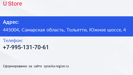 U-Store по адресу 445004, Самарская область, Тольятти, Южное шоссе, 4 в дальнейшем Организация, размещена в следующих категориях: