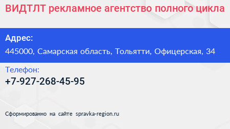 ВИДТЛТ, рекламное агентство полного цикла по адресу 445000, Самарская область, Тольятти, Офицерская, 34 в дальнейшем Организация, размещена в следующих категориях: