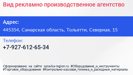 Вид, рекламно-производственное агентство по адресу 445354, Самарская область, Тольятти, Северная, 15 в дальнейшем Организация, размещена в следующих категориях: