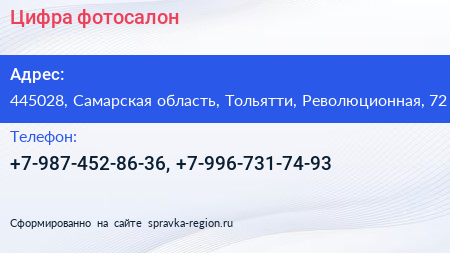 Цифра, фотосалон по адресу 445028, Самарская область, Тольятти, Революционная, 72 в дальнейшем Организация, размещена в следующих категориях: