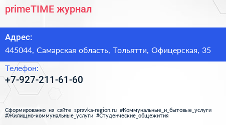 #primeTIME, журнал по адресу 445044, Самарская область, Тольятти, Офицерская, 35 в дальнейшем Организация, размещена в следующих категориях: