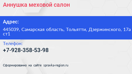 Аннушка, меховой салон по адресу 445039, Самарская область, Тольятти, Дзержинского, 17а ст1 в дальнейшем Организация, размещена в следующих категориях: