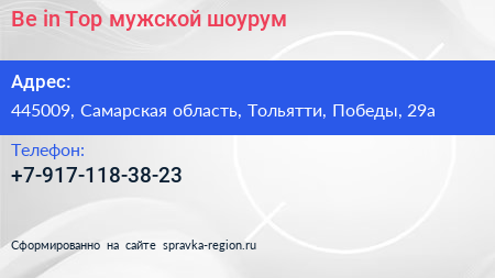 Be in Top, мужской шоурум по адресу 445009, Самарская область, Тольятти, Победы, 29а в дальнейшем Организация, размещена в следующих категориях:
