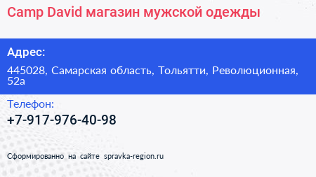 Camp David, магазин мужской одежды по адресу 445028, Самарская область, Тольятти, Революционная, 52а в дальнейшем Организация, размещена в следующих категориях: