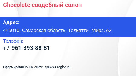 Chocolate, свадебный салон по адресу 445010, Самарская область, Тольятти, Мира, 62 в дальнейшем Организация, размещена в следующих категориях:
