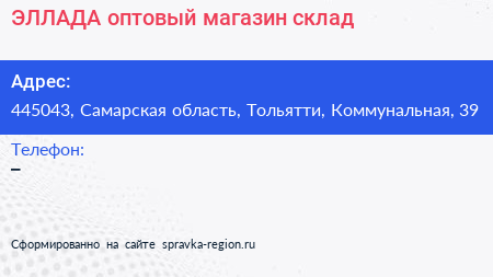 ЭЛЛАДА, оптовый магазин-склад по адресу 445043, Самарская область, Тольятти, Коммунальная, 39 в дальнейшем Организация, размещена в следующих категориях: