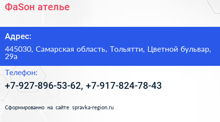 ФаSон, ателье по адресу 445030, Самарская область, Тольятти, Цветной бульвар, 29а в дальнейшем Организация, размещена в следующих категориях: