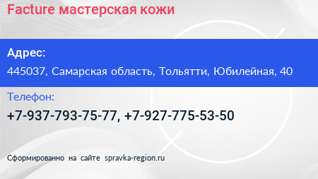 Facture, мастерская кожи по адресу 445037, Самарская область, Тольятти, Юбилейная, 40 в дальнейшем Организация, размещена в следующих категориях: