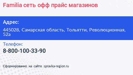 Familia, сеть офф-прайс магазинов по адресу 445028, Самарская область, Тольятти, Революционная, 52а в дальнейшем Организация, размещена в следующих категориях: