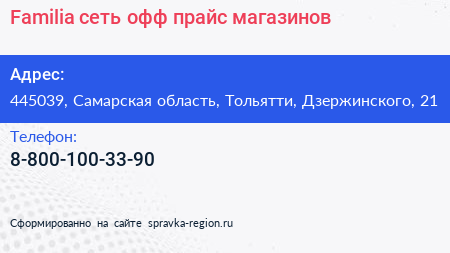 Familia, сеть офф-прайс магазинов по адресу 445039, Самарская область, Тольятти, Дзержинского, 21 в дальнейшем Организация, размещена в следующих категориях: