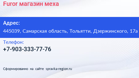 Furor, магазин меха по адресу 445039, Самарская область, Тольятти, Дзержинского, 17а в дальнейшем Организация, размещена в следующих категориях: