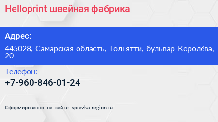 Helloprint, швейная фабрика по адресу 445028, Самарская область, Тольятти, бульвар Королёва, 20 в дальнейшем Организация, размещена в следующих категориях: