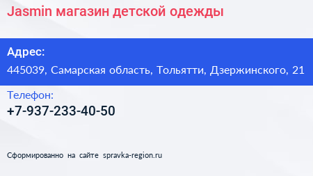 Jasmin, магазин детской одежды по адресу 445039, Самарская область, Тольятти, Дзержинского, 21 в дальнейшем Организация, размещена в следующих категориях: