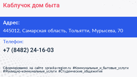 Каблучок, дом быта по адресу 445012, Самарская область, Тольятти, Мурысева, 70 в дальнейшем Организация, размещена в следующих категориях:
