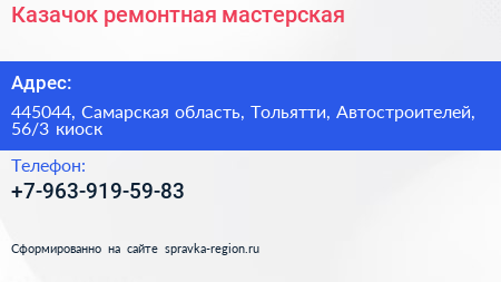 Казачок, ремонтная мастерская по адресу 445044, Самарская область, Тольятти, Автостроителей, 56/3 киоск в дальнейшем Организация, размещена в следующих категориях:
