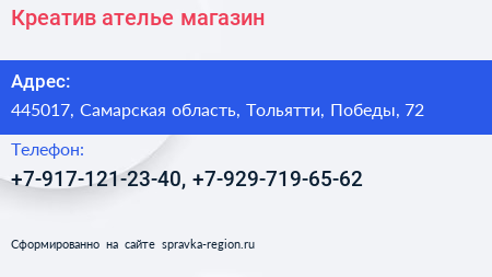 Креатив, ателье-магазин по адресу 445017, Самарская область, Тольятти, Победы, 72 в дальнейшем Организация, размещена в следующих категориях: