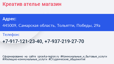 Креатив, ателье-магазин по адресу 445009, Самарская область, Тольятти, Победы, 29а в дальнейшем Организация, размещена в следующих категориях: