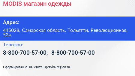 MODIS, магазин одежды по адресу 445028, Самарская область, Тольятти, Революционная, 52а в дальнейшем Организация, размещена в следующих категориях: