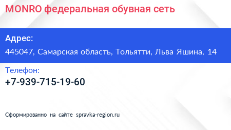 MONRO, федеральная обувная сеть по адресу 445047, Самарская область, Тольятти, Льва Яшина, 14 в дальнейшем Организация, размещена в следующих категориях: