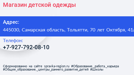 Магазин детской одежды по адресу 445030, Самарская область, Тольятти, 70 лет Октября, 41а в дальнейшем Организация, размещена в следующих категориях: