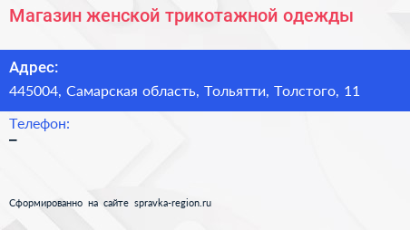 Магазин женской трикотажной одежды по адресу 445004, Самарская область, Тольятти, Толстого, 11 в дальнейшем Организация, размещена в следующих категориях: