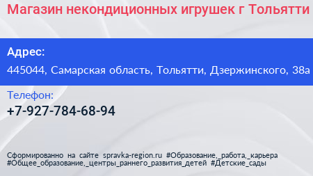Магазин некондиционных игрушек, г. Тольятти по адресу 445044, Самарская область, Тольятти, Дзержинского, 38а в дальнейшем Организация, размещена в следующих категориях: