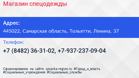 Магазин спецодежды по адресу 445022, Самарская область, Тольятти, Ленина, 37 в дальнейшем Организация, размещена в следующих категориях: