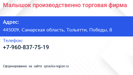 Малышок, производственно-торговая фирма по адресу 445009, Самарская область, Тольятти, Победы, 8 в дальнейшем Организация, размещена в следующих категориях: